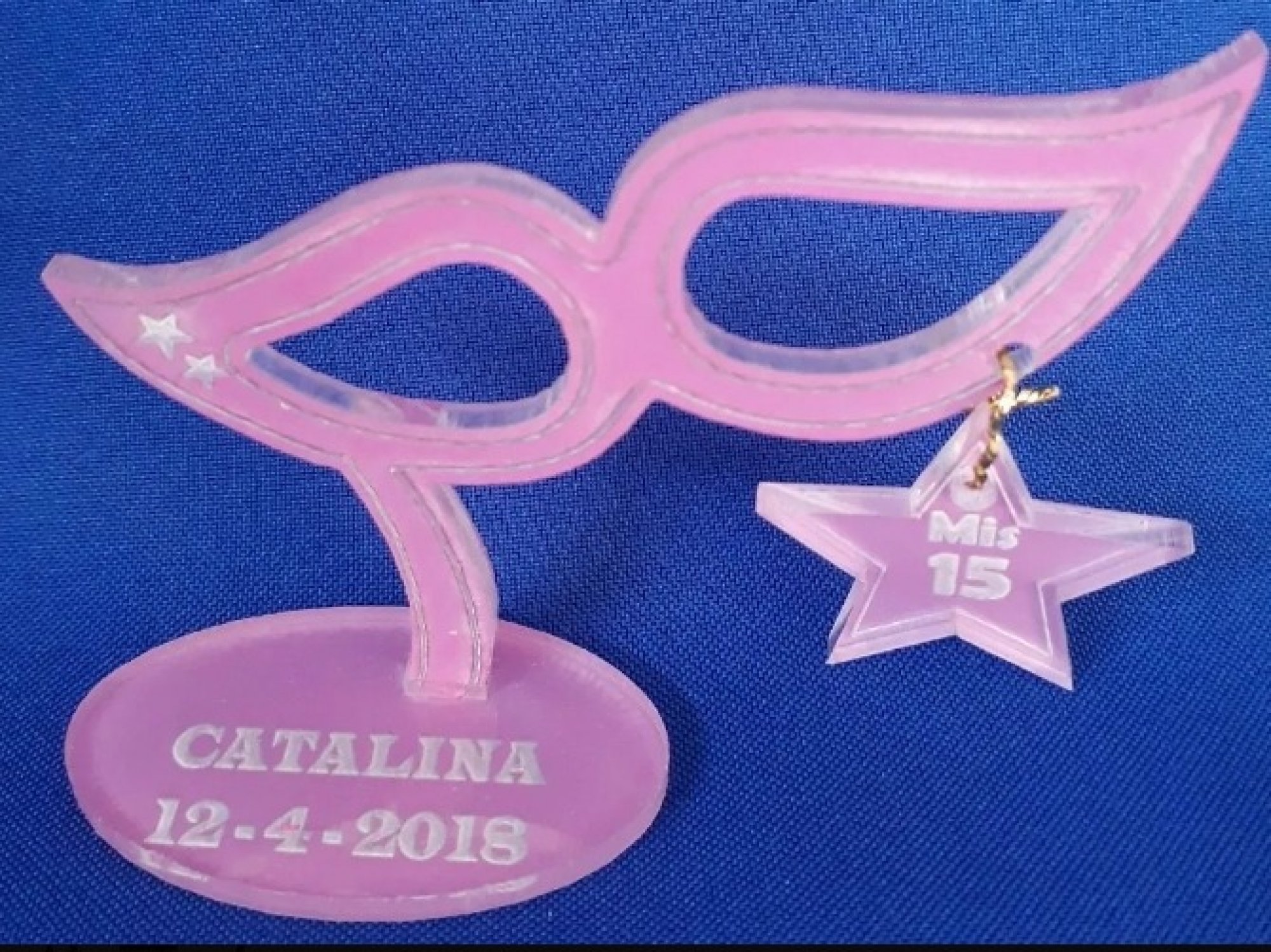 40 Souvenirs Antifaz en acrílico con color (a elección), con una medida de 6 cm, cortado y grabado a laser, con opción de personalizado sin cargo.