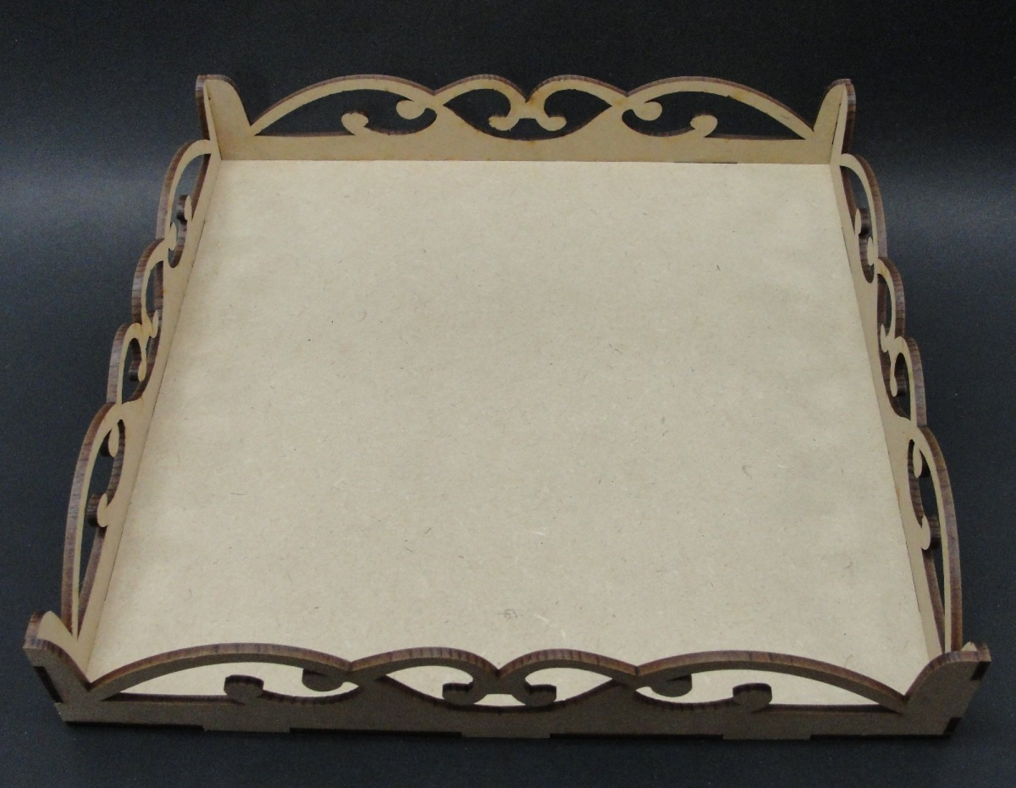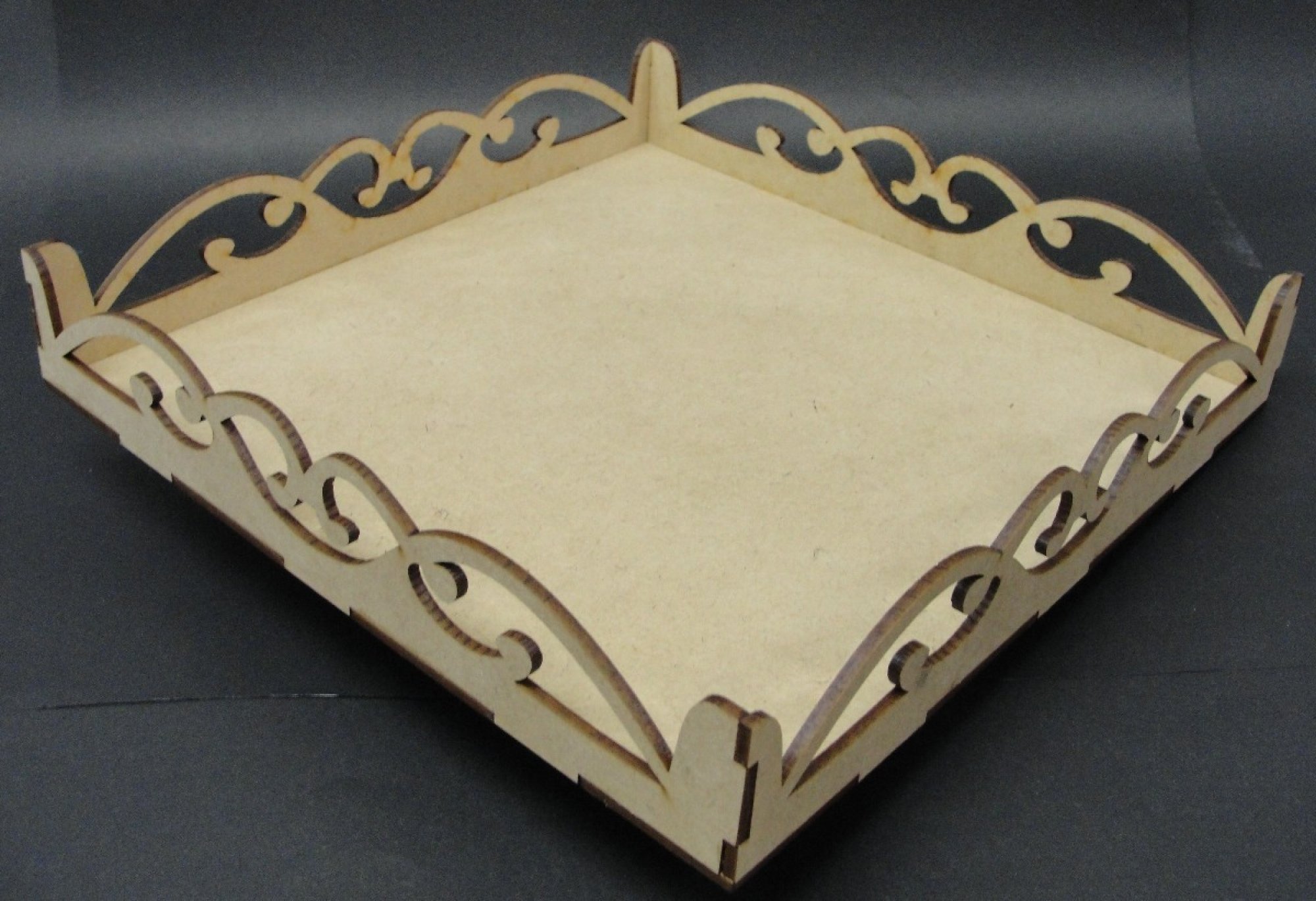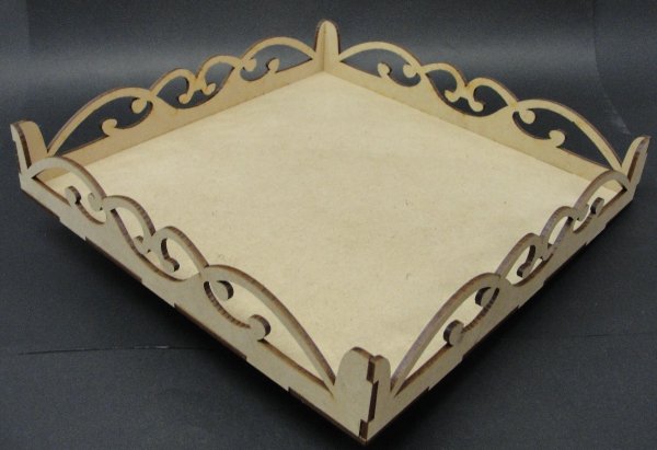 Bandeja con laterales de arebescos, en mdf de 3mm, ideal para el uso en tu hogar, regalar un presente a uns ser querido o para la decoración de tus fiestas de cumpleaños, casamientos, bautizos o primeras comuniones. Cuenta con una medida de frente de 25 cm, fondo de 25 cm y alto de 4,5 cm. Cortada y grabada a laser. Si deseas personalizado se realiza sin ningún costo.