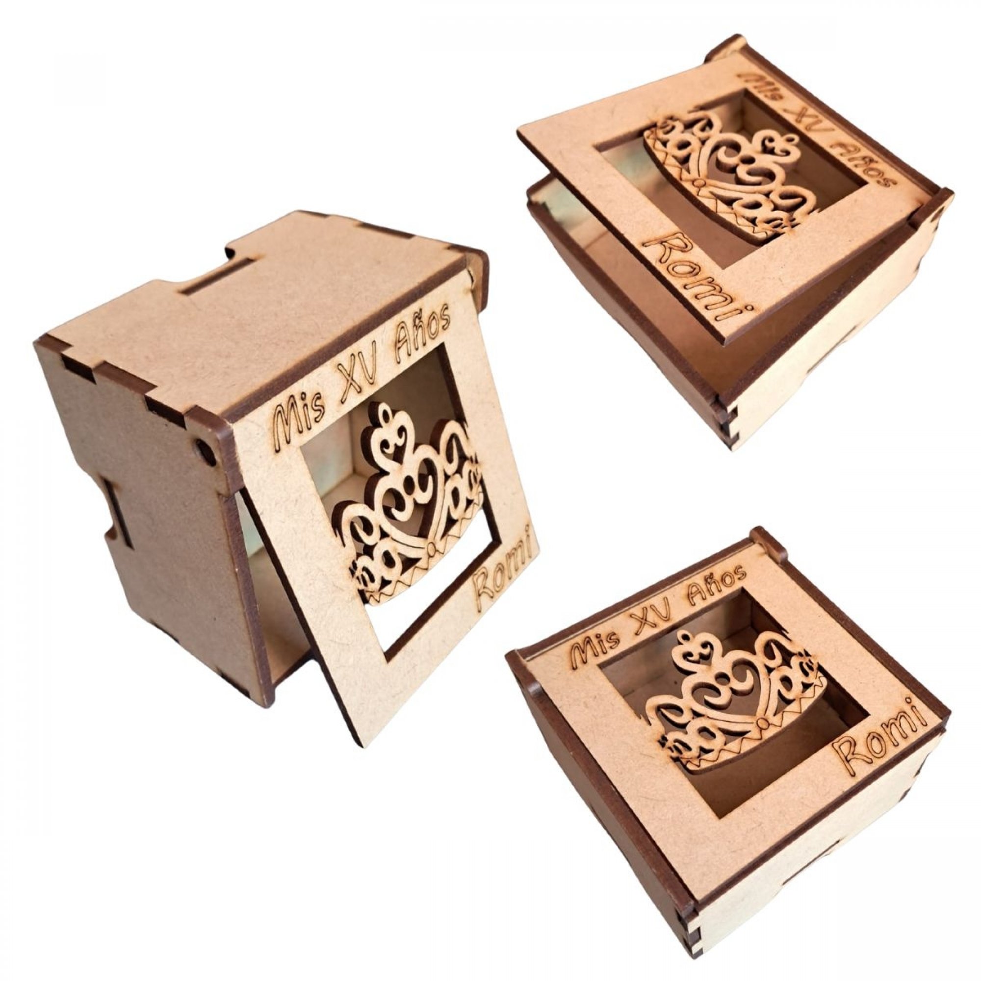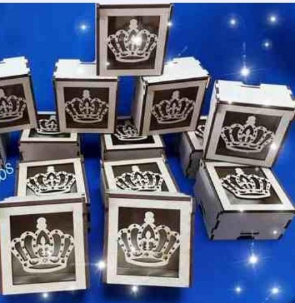 Souvenir Caja calada con corona en mdd , ideal para cumpleaños 15, bautismos, comuniones o bodas, con una medida de 8 x 8 cm aprox, cortado y grabado a laser, con opción de personalizado sin cargo.